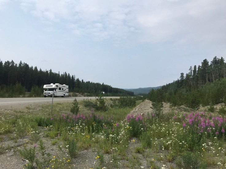 On the Alaska Highway. It rained on and off. We taped over the windshield crack so hopefully it won’t grow. It grew about a half inch so far. We intend to call insurance in the morning and take Arvi to Whitehorse to get it fixed.