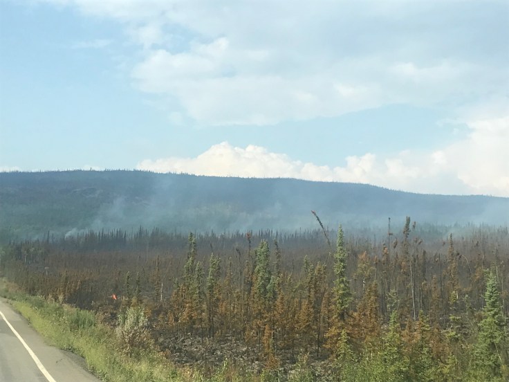 Twenty or thirty miles into the drive, we encountered smoke along the roadside, which made me quite nervous. We could see freshly burned trees. Why would they let us drive up this road? Continuing on, the air cleared, and we kept on driving.