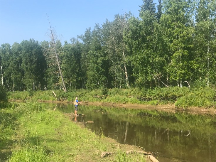 Well we were worried about the smoke in the campground. But when we woke up, it was sunny and we couldn’t detect any smoke. We got to do the things we imagined doing in Alaska – Tom fishing on the river while I putzed around doing this and that. It was a beautiful sunny morning.
