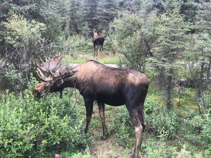 We visited the Denali Visitors Center and drove the 15 miles that they allow cars to go. Saw a BULL MOOSE cross RIGHT IN FRONT of Arvi!!! He looked at us while he was chewing leaves and we were stopped. Then he walked along Arvi’s bumper to the other side of the street. What a beautiful animal. Too bad the windshield was glaring and buggy.