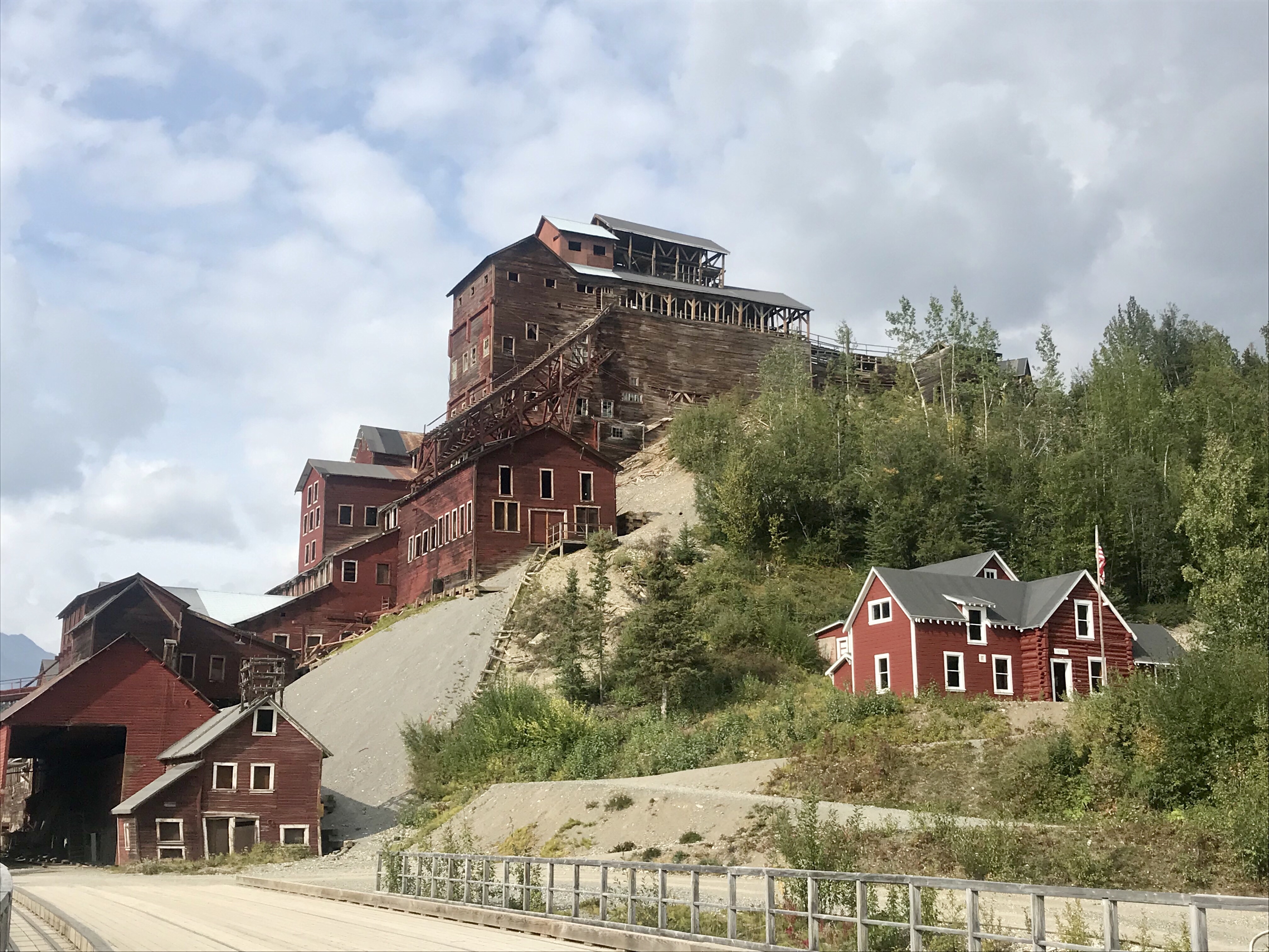 So here we are in the Wrangell-St. Elias National Park. This only became a park in 1980, and it is mixed in with private land and national wildlife preserve land, and some state land. The only way to get into the interior of the park is via two very rough, somewhat exciting roads. Today we took the southern road, called the McCarthy road, which takes you to the small town of McCarthy. Five miles up the road from McCarthy is the town of Kennicott. You cannot drive to either McCarthy or Kennicott – you have to walk or take a shuttle. We walked to McCarthy and took a shuttle five miles to Kennicott, where we toured the old mining town. We had a great time going in this 14-story copper mill, where copper comes via tram from the mine down the mountain to the mill, where it is broken, sorted, bagged, and put on a train for Cordova, in the Prince William Sound near Valdez.