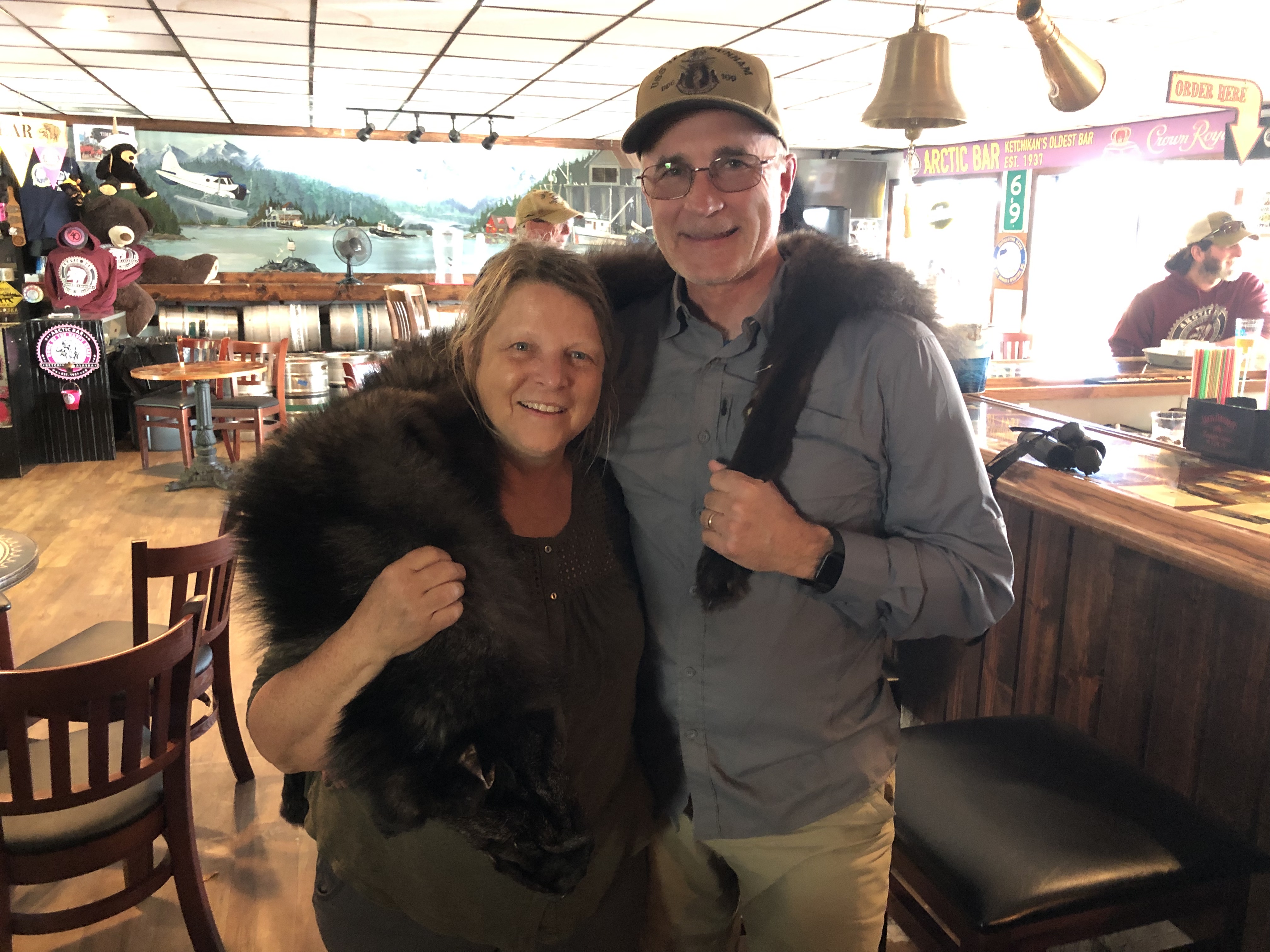 The The people we met in Alaska are for the most part easy to friend up. They have been great to get to know. Here we are in Ketchikan wearing a wolf pelt owned by our new friend Grayson.