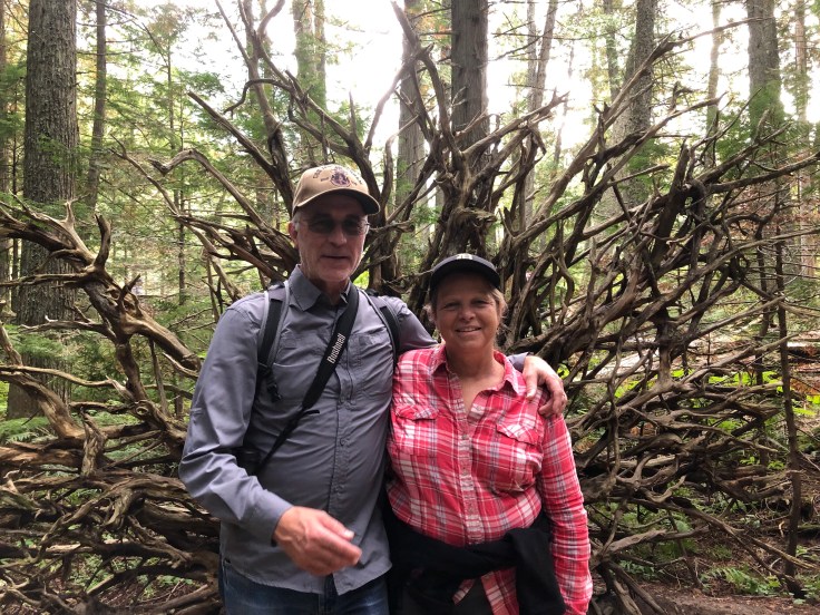 We had a smoked salmon omelette then went on a hike to Avalanche Lake. We walked five miles through a dark cedar rain forest and found the lake, along with a hundred other hikers. There were turbulent waterfalls on the way.