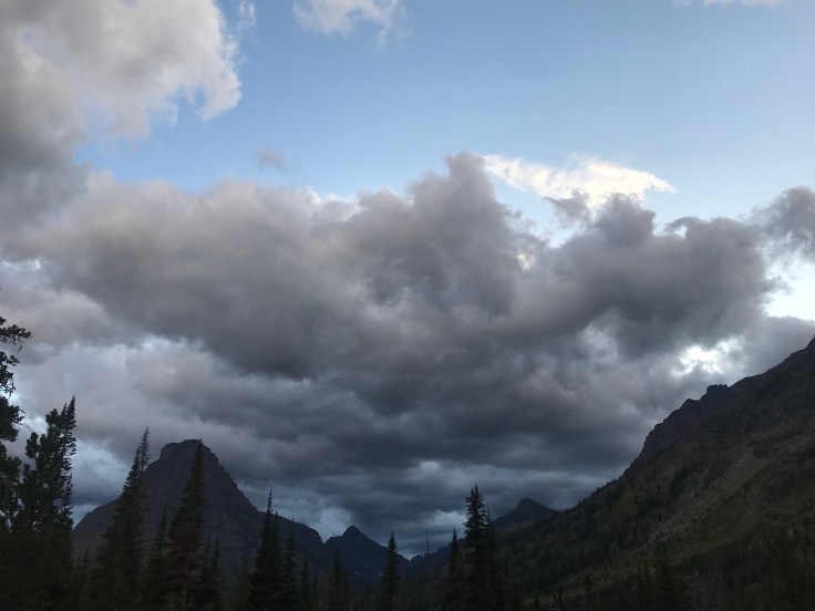 The weather changes dramatically from the plains to the national park, which is on the edge of the mountains. We went from partly sunny south of Glacier NP to the East Glacier entrance so Tom could do some fishing. At 10 AM, the campground was quickly filling up. The wind was fierce and it rained before long. No fishing today.