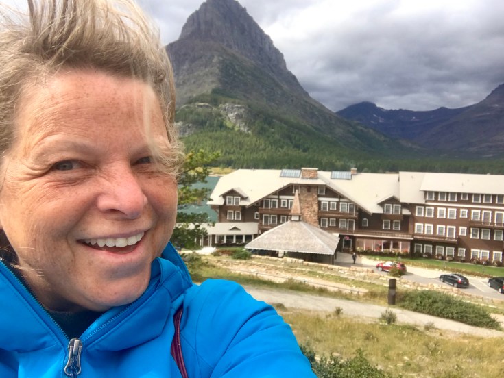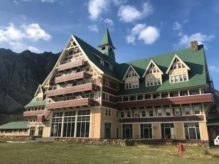 We left the windy and rain-threatened Two Medicine Campground and checked out the Many Glacier entrance to Glacier NP. It was windier. I checked out Many Glacier Hotel there while Tom checked out a new squeak in the vehicle that we couldn’t find. The hotel was just nice. The workers wear lederhosen.