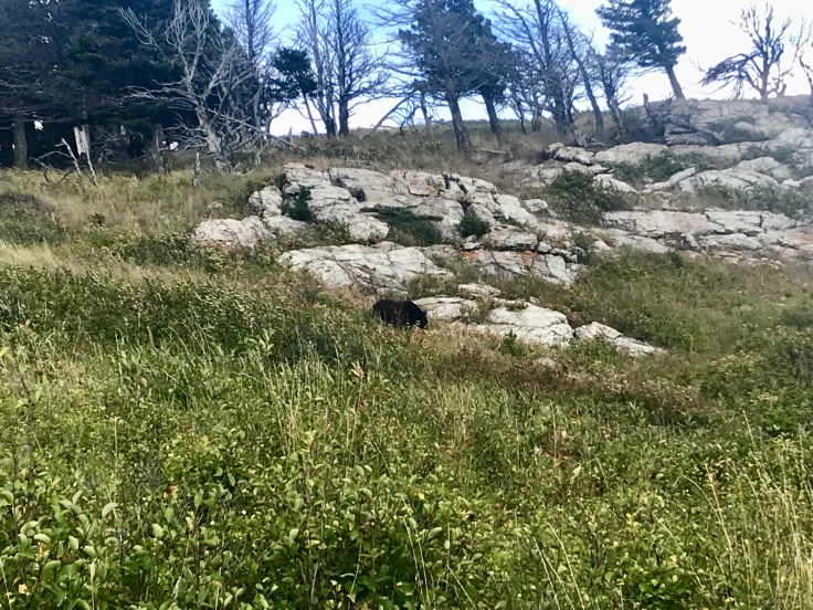 On the walk back down the hill, a bushy and curving path, we passed a grizzly bear maybe 75 yards away. The bear was very busy eating berries. We were still nervous.