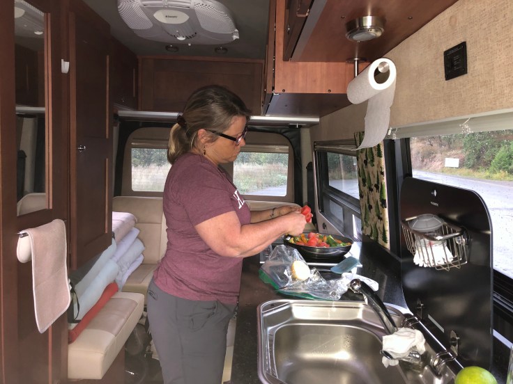 Then where to stay for the night. I found a place to boondock so we headed for it. I didn’t realize the spot was way up a mountain, but up we went. The road was newly finished and we passed a beautiful view of the lake below. But we had second thoughts about that.