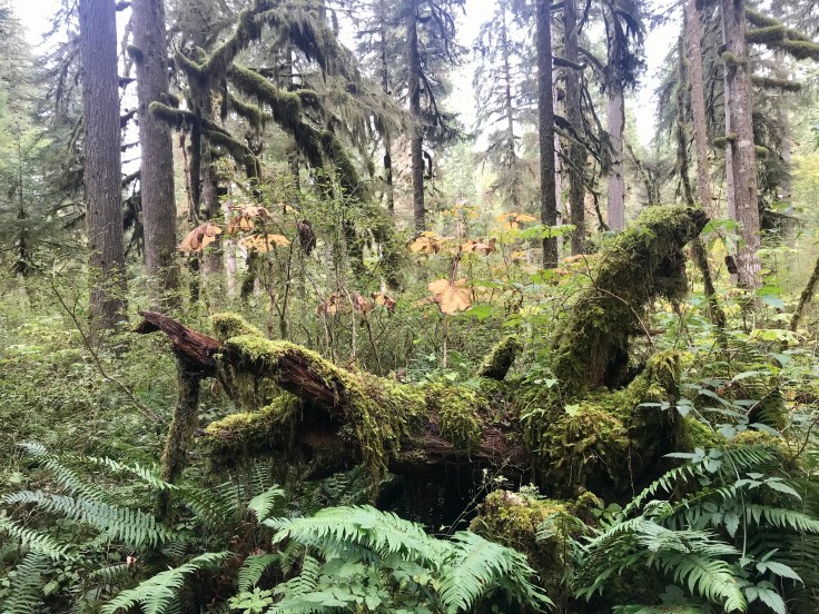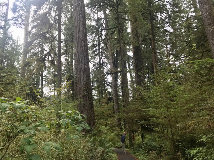 Looking to get a good view of Mount Baker, we drove the east side of North Cascades NP per advice of the ranger at Newhalem. We only got a glimpse of a piece of the flank of the mountain when the sun popped out for a few seconds. Fail. Bad advice from the ranger, too. However, we passed Shadow of the Sentinels trail and checked it out. We didn’t find out why last century’s loggers left these few hemlocks and Douglas firs standing. But this was a cool trail through some giants.