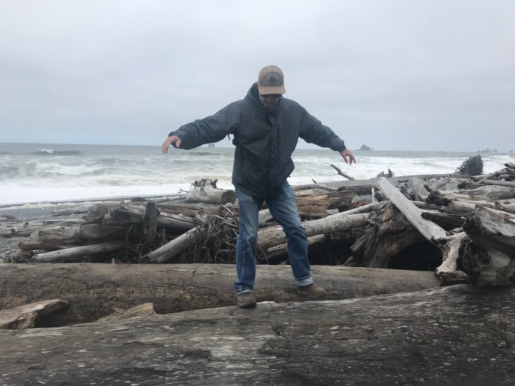 We checked out the ocean at Rialto Beach near La Push. It felt pretty wild, with large waves breaking on the drizzly stony beach, and with lots of huge driftwood tree trunks creating a kind of break wall. Somehow that ocean felt too close to us, standing between the many driftwood logs and the large, foamy waves.