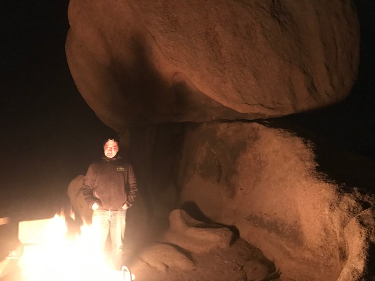 Many people were climbing the rocks and watching the sky at sunset. After dinner we had a reprieve from the Santa Ana winds. Tom built a warm fire at our campsite. The Joshua Tree campground fires are all very cool, because the fire rings are set near large rocks and the fire casts shadows on the large rocks.
