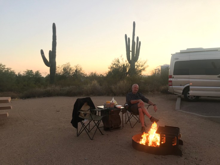 We just love this campground we are staying in. It has clean showers nearby, fresh water at our site, a dump station, good space between the sites with iconic saguaro cactus all over, a visitor center, good cell signal, proximity to town, very friendly clientele, a night sky full of stars and a full moon. It all has been nothing short of perfection. So we signed up for a second night here.