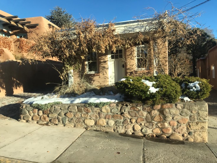 We were happily driving north past Albuquerque into Santa Fe. It was a sunny afternoon. Santa Fe was so pretty, with all of the adobe buildings. The temperature was in the 40s. When we got into town, we saw piles of snow around the buildings. It was so pretty.
