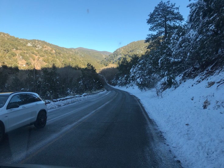 We were creeping along with nowhere to pull over and nowhere to turn around. The road was covered with patches of ice from melting snow, curving, going up and up and up, with trees on both sides of it now. Around the next curve on the next uphill slope there was a Prius sideways in the road. A young man was standing next to the car and Tom asked him what the heck they were doing. They were trying to turn the Prius around and go back down the hill. That took them some time as they were in an awkward position. We were worried that they would slide down the hill into us while we waited for them.