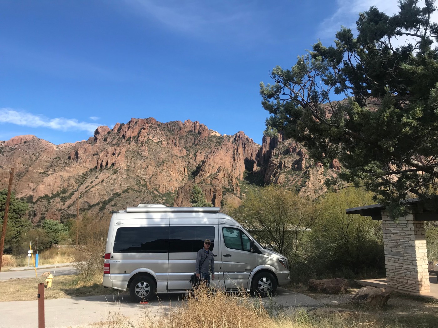 We camped in the Chisos Basin early in the day. It turned out to be a great campground as it has flush toilets and good cell signal. We grilled steaks using charcoal and the grill in the picnic table shelter.