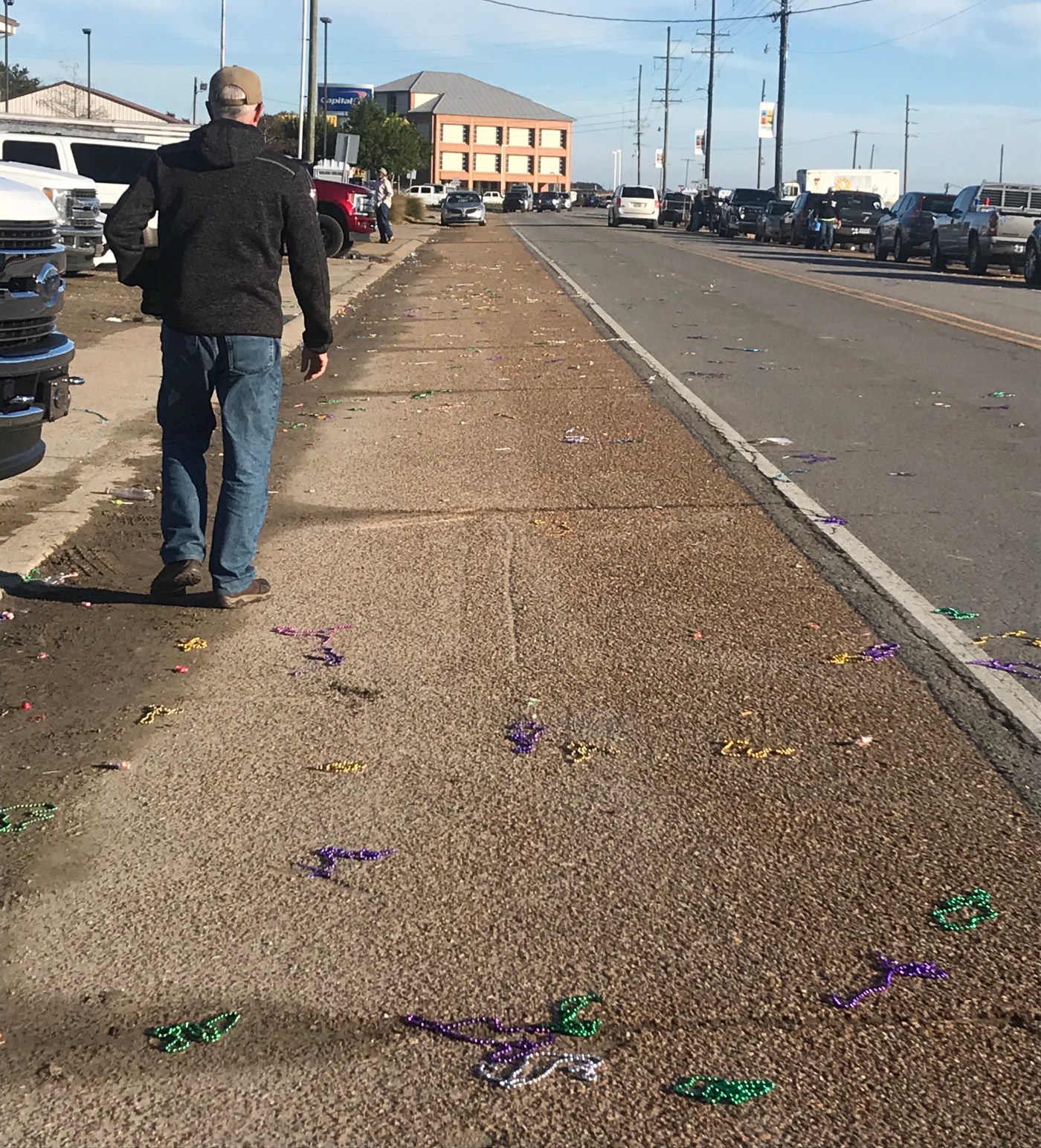 The town of Cameron, beyond the ferry ride, was holding a Fur and Wildlife Festival. We must have missed the parade, because we saw loads of Mardi Gras beads laying in the street.