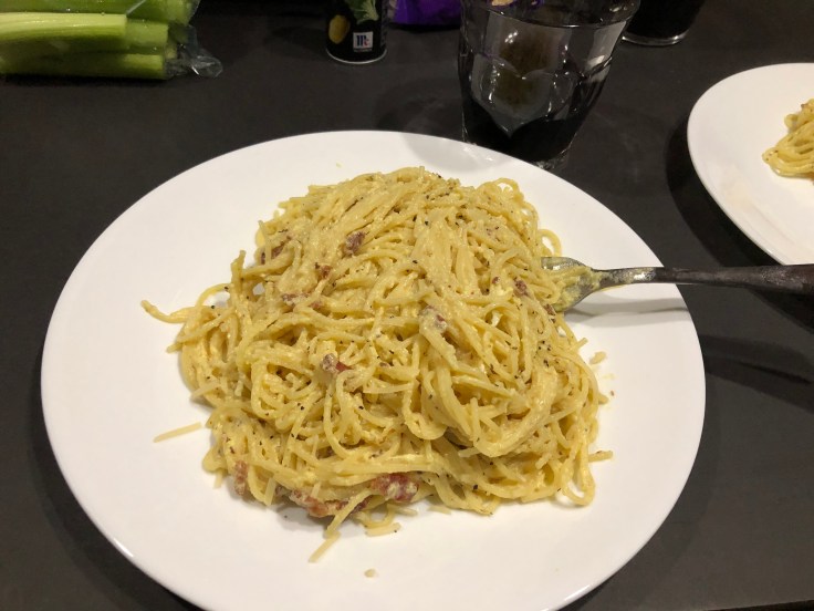 Pasta, eggs, bacon (because we had bacon and not pancetta), and cheese (we used Parmesan because we had it handy).