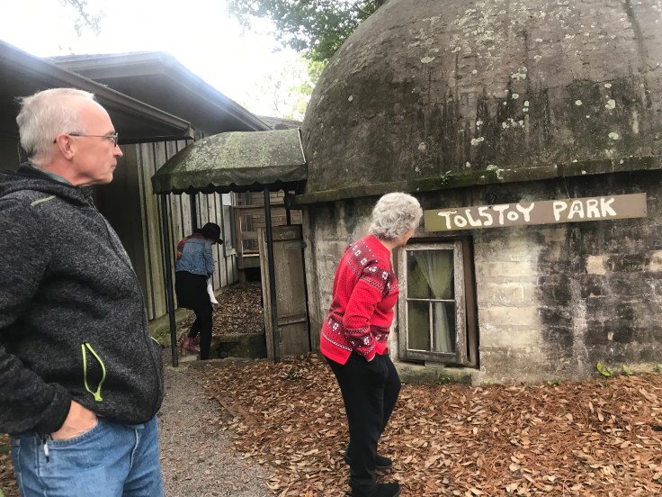So now we are in Mobile at our friend Katherine’s house. Katherine took us to the Flora-Bama bar on the state line. On the way we stopped at Montrose. Here is a round hut built by a man with tuberculosis who, given a year to live, moved from Idaho in 1926 and lived off the land 24 more years (I intend to read The Poet of Tolstoy Park, which tells the story of this hermit).