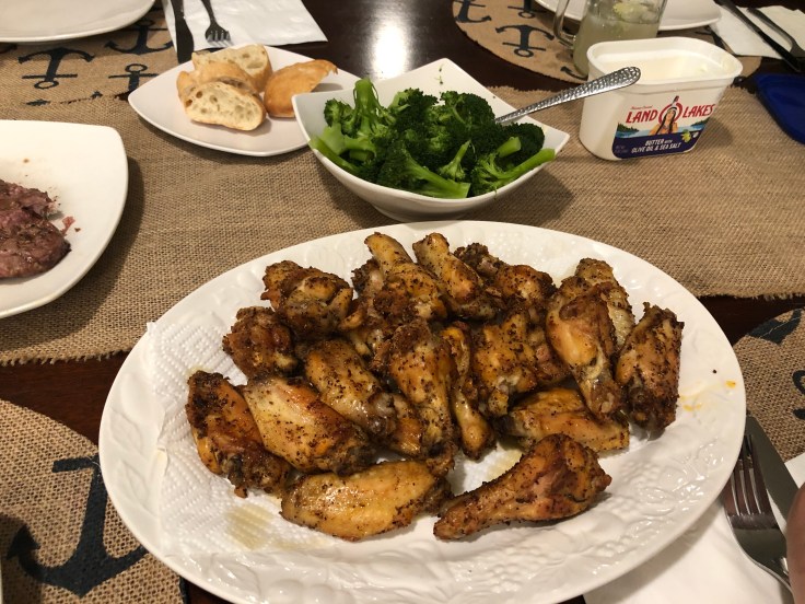 My brother Joel really knows how to cook chicken wings. I think Tom and I gave him a pleading look, so they got some wings and cooked them for dinner. These wings rock even without sauce!