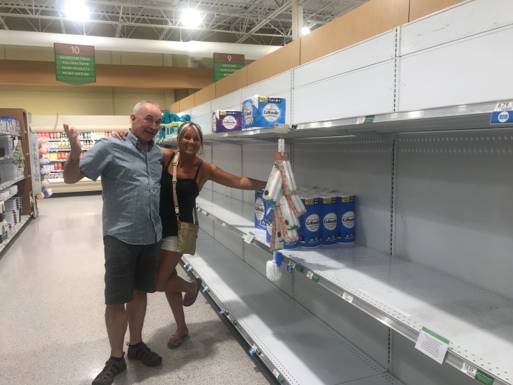 After dinner out at a crowded restaurant with Yvonne tonight, we looked at Bunche Beach, then we stopped at the grocery store. The store was short on toilet paper, so we picked some up. Tom and I got some cans of chicken soup, in case we got sick….. again.