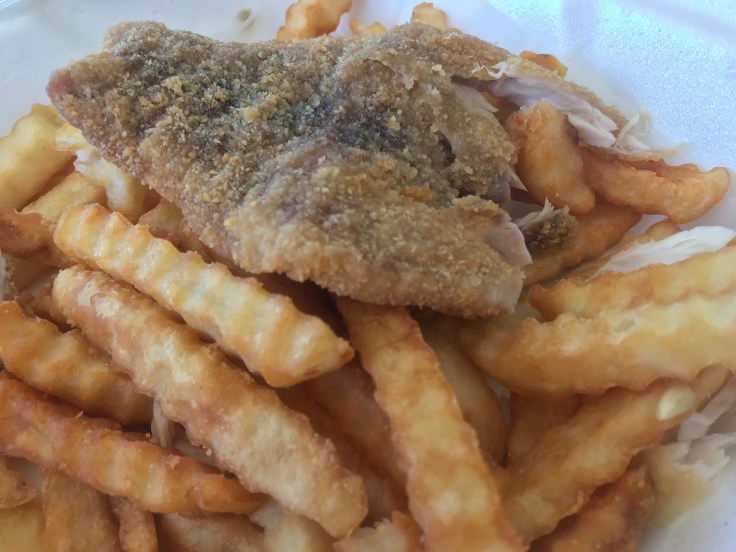 While we were putting the boat in, we ordered a mullet basket carry out from Capt’n Cons near the boat ramp. Before Florida, I thought mullet was an 80’s hairstyle, but it’s a plentiful fish here that feeds on plants and algae. We are told it’s not great to eat. Since Capt’n Con’s sells it, I wanted to try it. It was okay but not great. Tom thought it tasted like largemouth bass.