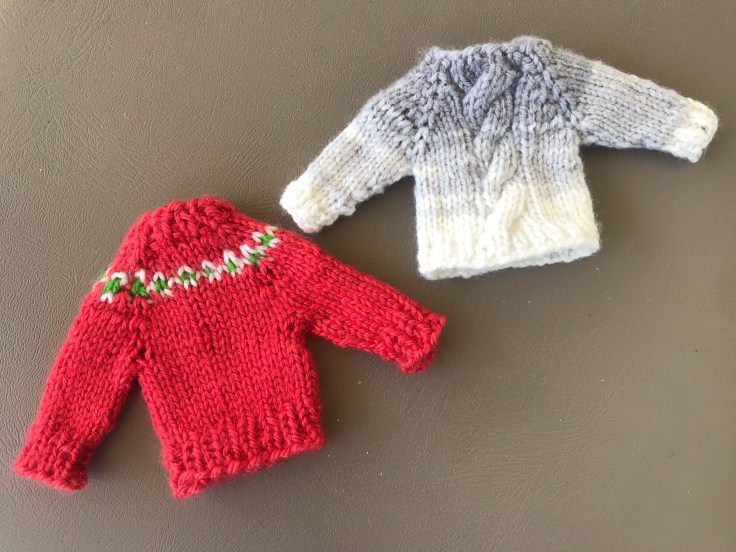 Being an introvert, I don’t mind being stuck at home. For a while. I finished another miniature sweater that I am pleased with. I have knitted six of these, and I am finally happy with the pattern I developed.