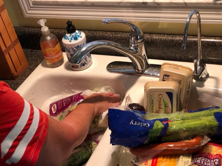 Tom was the “dirty“ person. He looked through the plastic bags, and anything that did not need refrigeration went into the shed for a three day holding period. The bags with produce, meat, dairy, etc. were brought up and set on the glass stove surface.