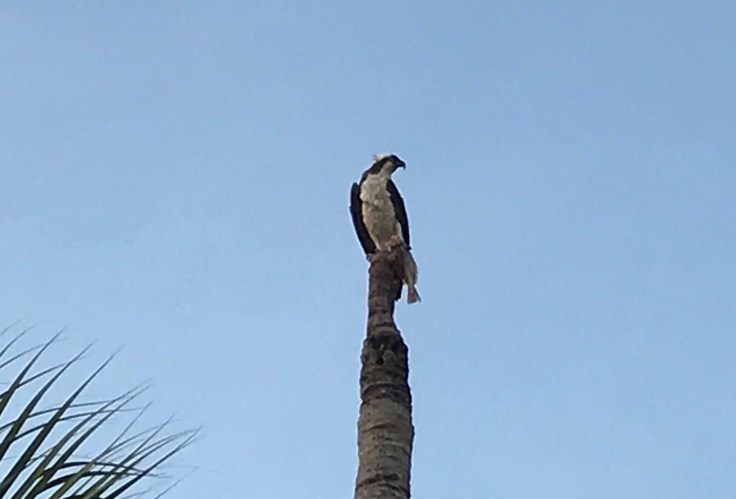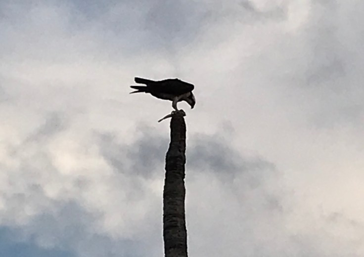 There are three osprey nests on this short street alone. We have become what I consider friends with these osprey. We look at each other a lot. They have a sweet innocent chirp which is inconsistent with their size and prowess. That is not an osprey tail in the photo – it is a fish!