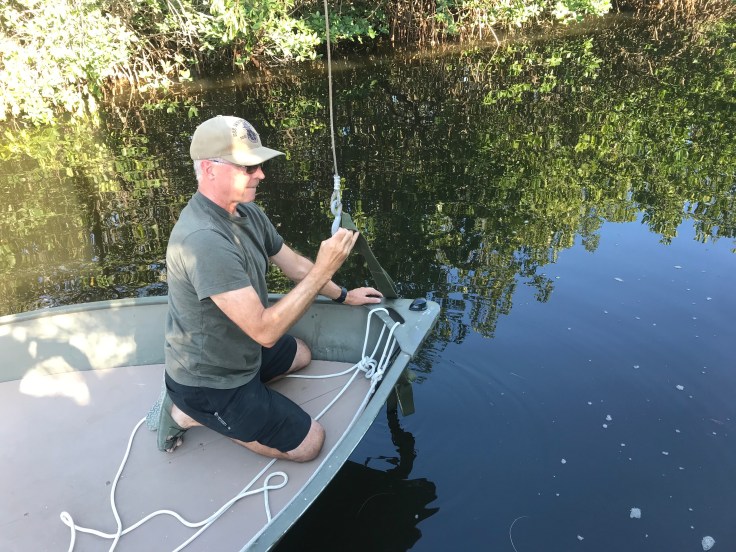 I liked having the boat tied along the canal. It seems to be a lot of work to pull the boat in and out of the water with each use, but Tom says he is supposed to rinse the motor after having it in salt water, so this is a good thing to do.