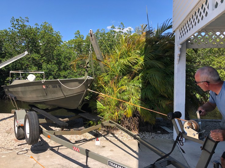 Tom used the davits to lift the boat onto the boat trailer! He heard it could be done, so he wanted to try it. He thought maybe next time he would just pay the $10 and go to the boat ramp.