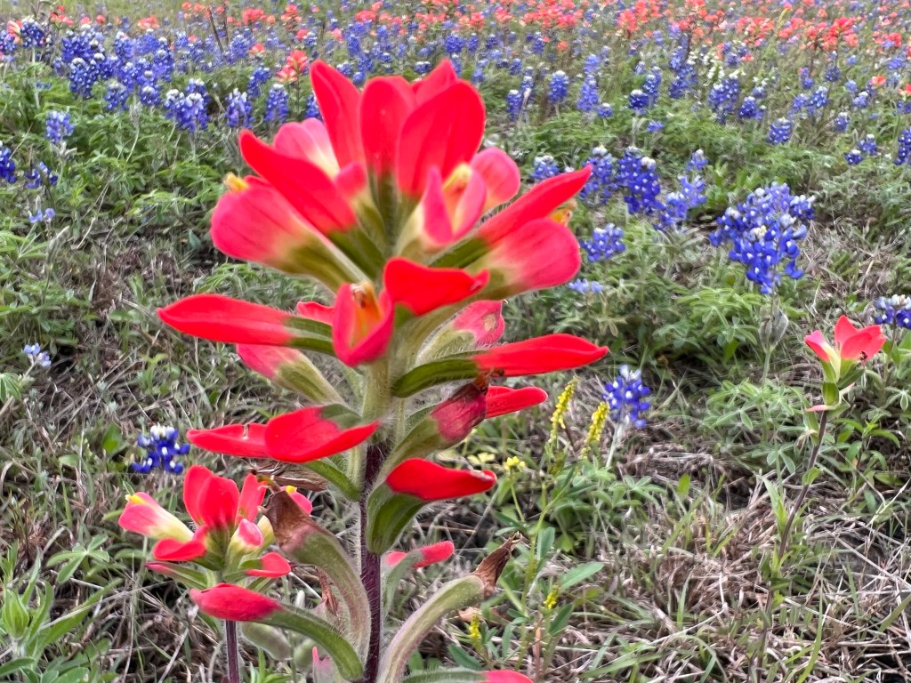 The point of coming down here was to see the wildflowers in bloom. We found Bluebonnets while traveling south between Dallas and Houston. This is a pretty good representation of what we saw. There were a couple fields bountiful with them. However they didn’t photograph well. The orange flowers are the Texas Indian Paint Brush.